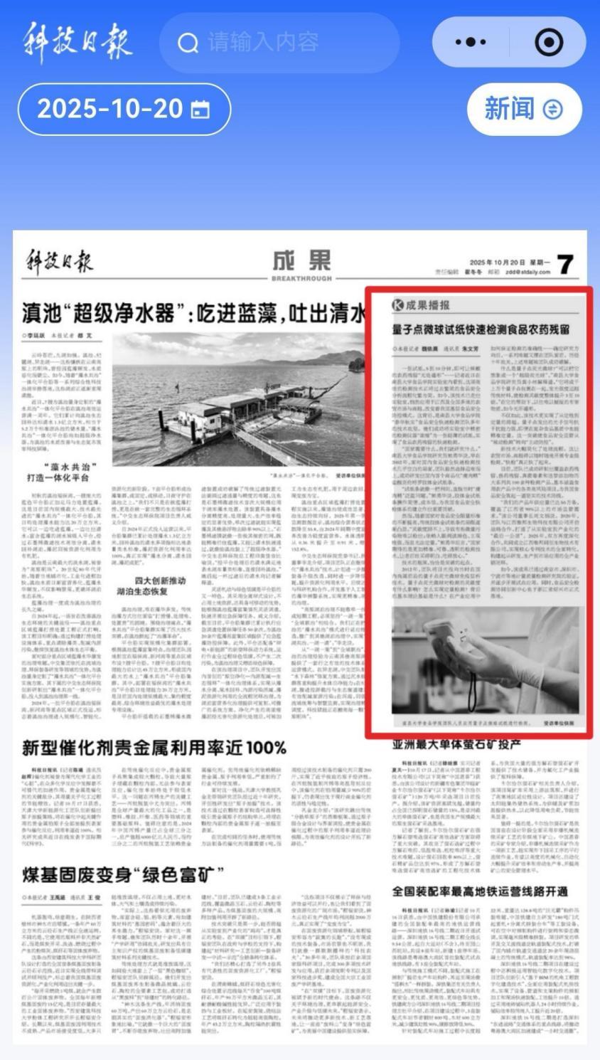编者按:10月20日,《科技日报》纸质版第七版刊登题为《量子点微球试纸快速检测食品农药残留》的文章,报道我校食品学院“春华秋实”食品安全快速检测团队经过多年的技术攻坚,成功研发量子点荧光微球试纸,实现了食品农药残留的快速检测。详情如下:
