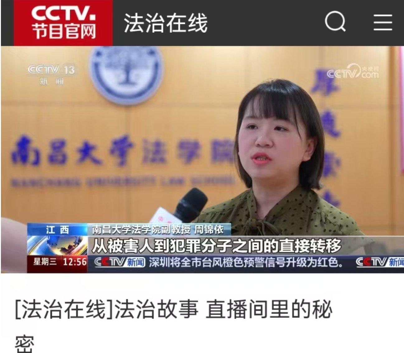 编者按:9月24日,中央电视台新闻频道法治在线栏目以《法治故事|直播间里的秘密》为题报道直播间里的充值诈骗案件,并邀请我校法学院副教授周锦依作专家解答。详情如下:
