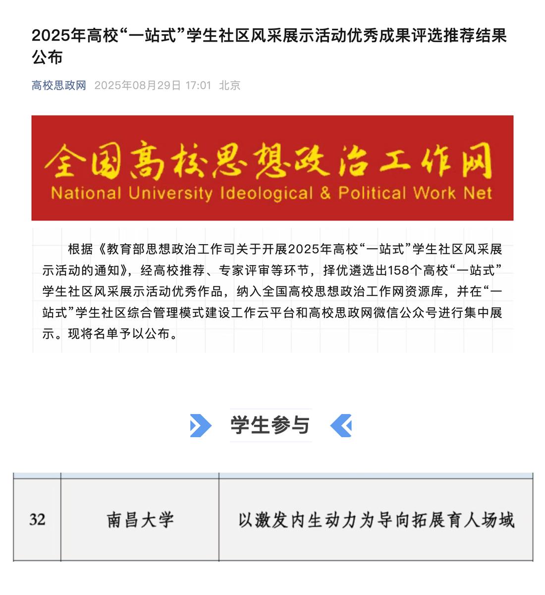本网讯(党委学生工作部)近日,教育部思想政治工作司公布2025年高校“一站式”学生社区风采展示活动优秀作品,南昌大学报送的典型案例《以激发内生动力为导向拓展育人场域》获评“优秀作品”,并纳入全国高校思想政治工作网资源库。自2022年首届活动以来,我校连续三次获此荣誉,先后入选5篇作品,数量位居全省首位。
