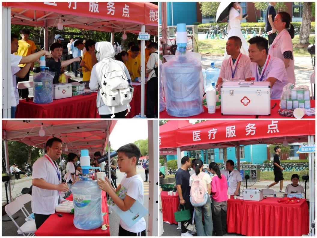 校医院医疗点前,急救药品、防暑物资分类整齐陈列,医护人员仔细检查着血压仪、急救箱等设备,随时准备为新生提供健康咨询、应急处理等服务,用专业守护为迎新工作加上“安全锁”。