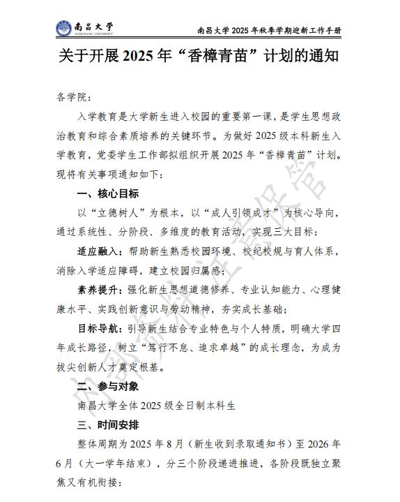 早在新生报到前,学校开展了2025年“香樟青苗”计划,系统推进2025级本科生入学教育。入学教育分为“集中教育”“大学适应”和“综合发展”三个阶段,包括理想信念与红色教育、校史校情教育、家校协同启蒙、心理健康教育、校规校纪等多元主题,为把学生培养成堪当大任的时代新人打下坚实基础。