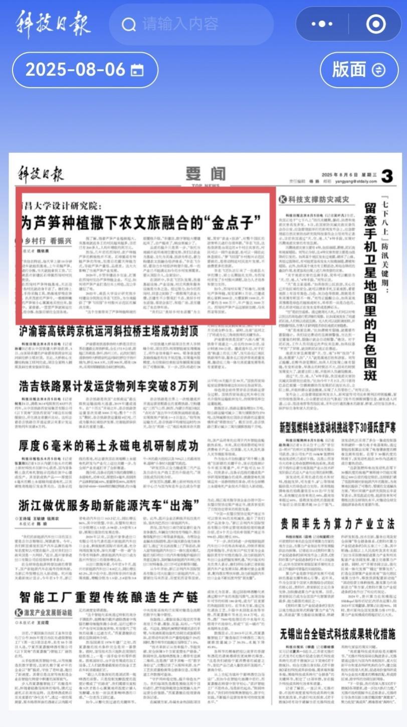 编者按:8月6日,《科技日报》第三版要闻【乡村行 看振兴】栏目以《南昌大学设计研究院:为芦笋种植撒下农文旅融合的“金点子”》为题,报道我校李名飞团队为南昌市新建区石埠镇西岗村提供“梦飞田园”乡村振兴示范区解决方案的举措成效。详情如下: