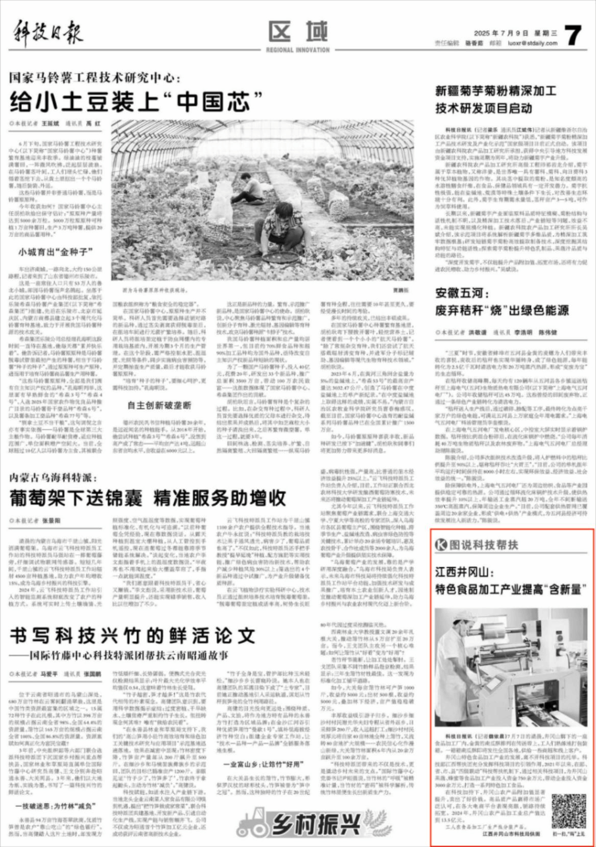 编者按:7月9日,《科技日报》报道科技部帮扶团积极推动南昌大学科研团队入驻车间开展攻关,南昌大学与井冈山市共建食品与健康产业研究院,组建专家团队,在技术、人才、平台等方面投入优质资源,为食品加工产业持续发展注入科技动力。内容如下: