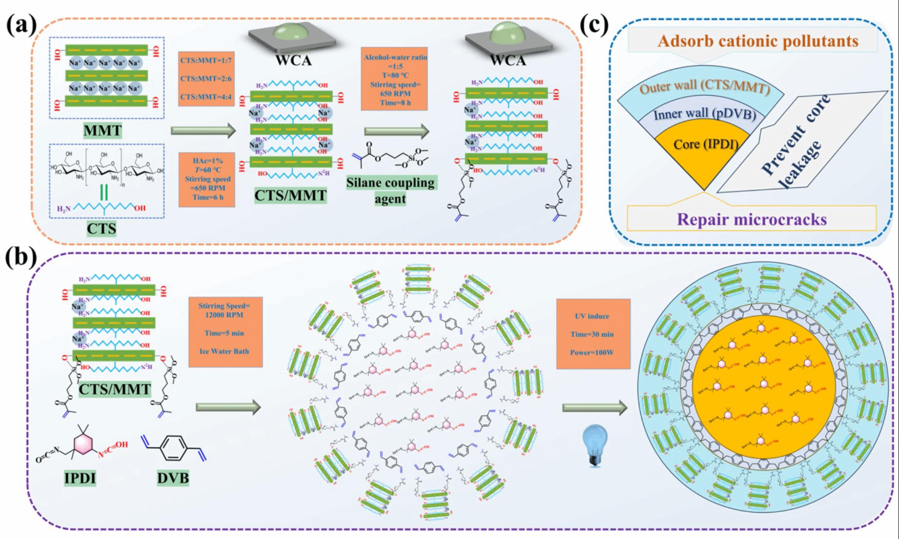 除此之外,王信刚教授团队在Chemical Engineering Journal发表聚焦于阳离子污染环境中金属腐蚀防护的研究工作。以壳聚糖插层蒙脱土为壁材,采用Pickering乳液光聚法制备功能耦合微胶囊。研究发现,壳聚糖插层增强了蒙脱土对亚甲基蓝和铜离子的吸附性能,特别是减少了吸附平衡时间,从40分钟缩短至10至20分钟。将这些微胶囊加入环氧涂层中后,涂层表现出卓越的腐蚀防护效果。在3.5wt%NaCl溶液中浸泡10天后,涂层未出现腐蚀迹象,腐蚀抑制效率高达99.86%。论文的第一作者为南昌大学博士研究生郭冠军,王信刚教授为唯一通讯作者,南昌大学为唯一通讯单位。