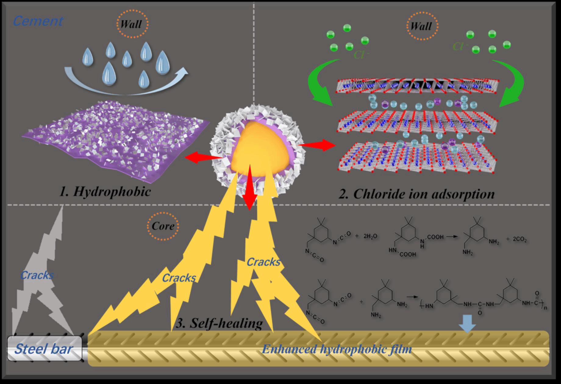 2025年6月底,南昌大学王信刚教授团队在Cement&Concrete Composites发表最新研究成果,成功开发出基于LDH的功能化微胶囊(LFMCs)。采用Pickering乳液光聚合法制备微胶囊,将LDH的氯离子吸附功能与微胶囊自修复功能相结合,构建了“吸附-阻渗-修复”三重防护体系。研究表明,微胶囊对氯离子的最大吸附量达22.791 mg/g,可使水泥基体抗压强度恢复率提升15.17%,显著增强钢筋耐腐蚀性能。这项突破为海洋工程等严酷环境下的混凝土结构耐久性提升提供了全新解决方案。论文的第一作者为南昌大学博士研究生钟艺伟,王信刚教授为唯一通讯作者,南昌大学为唯一通讯单位。