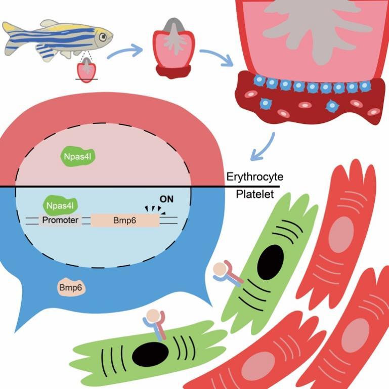 图1 血小板Npas4l-Bmp6信号调控斑马鱼心脏再生工作模式图