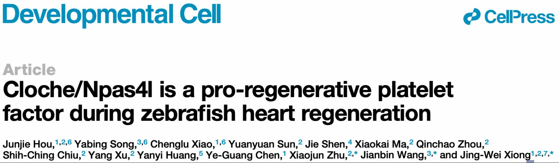 本网讯(基础医学院) 近日,基础医学院、第二附属医院和生物医学创新研究院熊敬维教授与清华大学王建斌研究员等研究人员合作,在中国科学院一区TOP期刊Developmental Cell发表题为“Cloche/Npas4l is a pro-regenerative platelet factor during zebrafish heart regeneration”的重要研究,揭示了血小板及其来源的Npas4l-Bmp6信号在促进斑马鱼心肌细胞增殖和心脏再生中的重要功能。