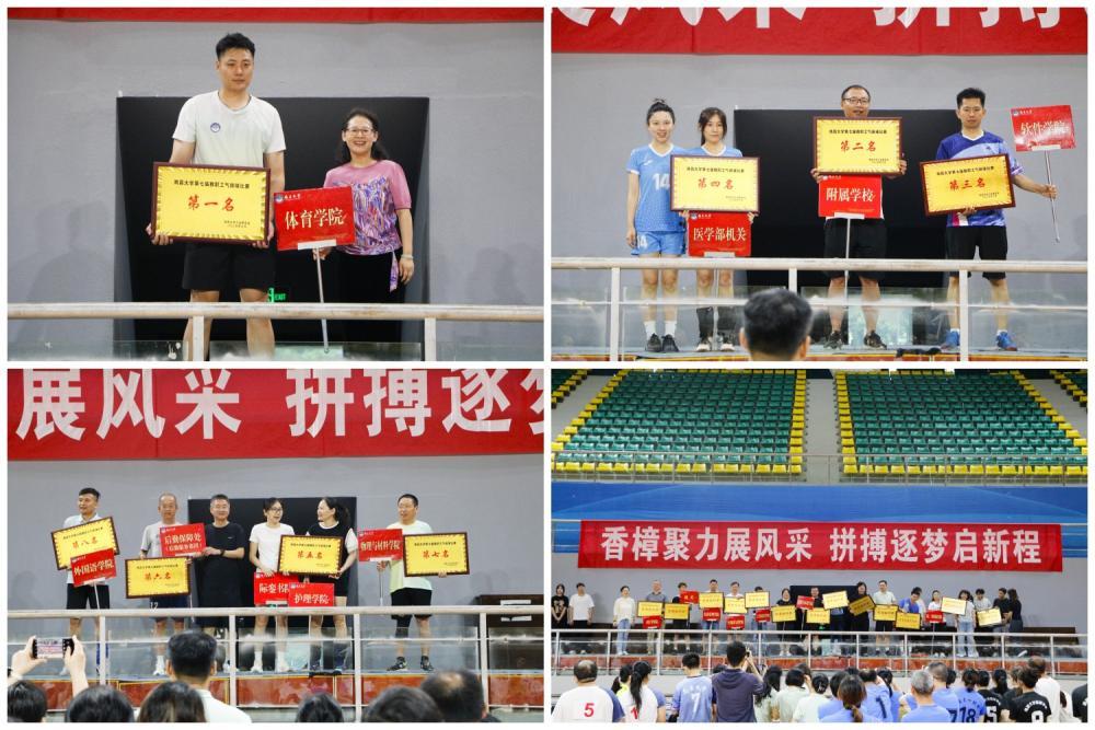 经过激烈角逐,体育学院代表队荣膺冠军,附属学校代表队和软件学院代表队分获亚军、季军;医学院机关、护理学院、后勤保障处(后勤服务集团)、物理与材料学院、外国语学院代表队分列第四至第八名;第一附属医院、第二附属医院代表队获评“体育道德风尚奖”,公共政策与管理学院等14个代表队荣获“优秀组织奖”。活动的举办,为教职工搭建了强健体魄、切磋技艺的平台,进一步凝聚了教职工干事创业精气神。