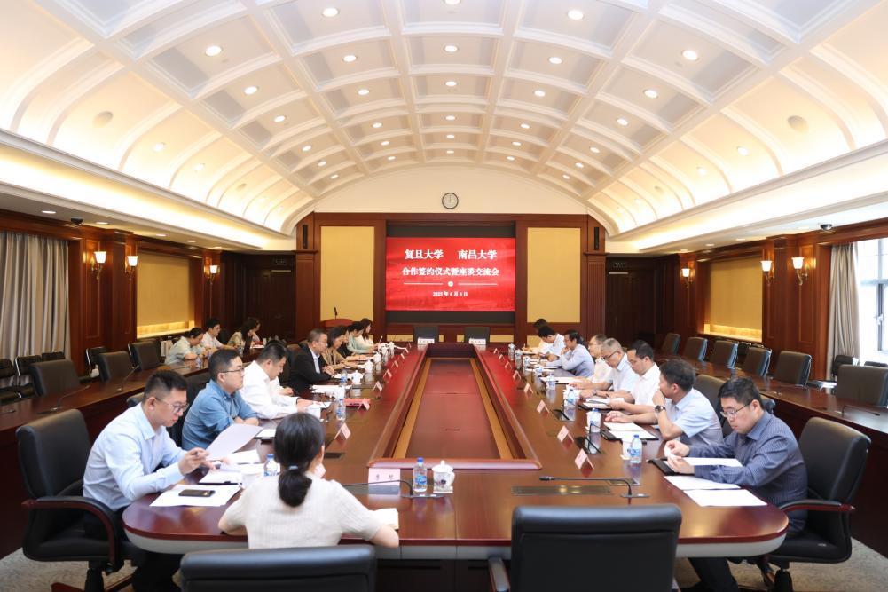 复旦大学校长、中国科学院院士金力,南昌大学校长、中国科学院院士陈晔光,复旦大学常务副校长许征,南昌大学党委常委、统战部部长、人事处处长谈振兴见证签约。南昌大学副校长聂少平与复旦大学党委常委、校长助理、统战部部长、科学技术研究院院长、中国科学院院士彭慧胜代表双方签约。