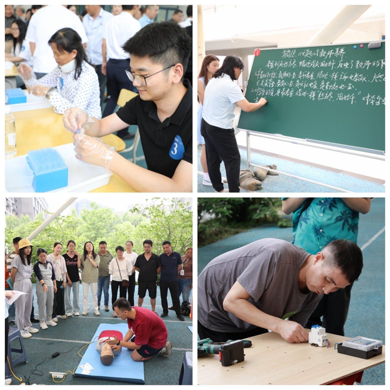 活动现场气氛热烈,亮点纷呈。在板书书写区,老师们笔锋遒劲、布局精巧,展现了“三尺讲台育桃李”的师者匠心;在实验操作区,“点亮‘五一’”项目要求选手精准连接线路、制作灯牌,考验专业技能与审美能力,戴手套插枪头,比拼的是选手的速度与精准;急救技能考场内,单人心肺复苏操作规范严谨,彰显生命教育的温度;运输技能赛场热火朝天,拆装轮胎与倒车移库环节尽显教职工“硬核实力”;餐饮技能区香气四溢,参赛选手以刀工如飞、火候精准的技艺奉献味觉盛宴;创意手工区上的剪纸、手工作品栩栩如生,将传统技艺与现代创意完美融合;AI+教育教学案例展示则凸显了前沿科技与教育实践的深度融合。