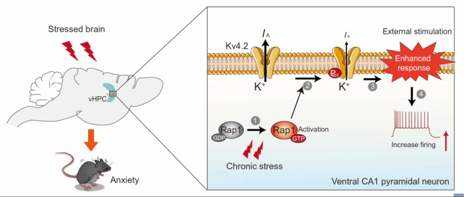 本研究发现慢性压力应激选择性上调海马区Rap1活性(Rap1-GTP水平升高),而不影响其总蛋白表达。进一步筛选发现腹侧海马锥体神经元中Rap1活性上调对于慢性应激致焦虑至关重要。机制上,Rap1激活通过促进电压门控钾通道Kv4.2 Thr607位点磷酸化,降低A型钾电流,导致锥体神经元过度兴奋。通过特异性抑制腹侧海马锥体神经元Rap1活动或阻断Kv4.2 Thr607位点磷酸化,均能有效逆转慢性应激引起的锥体神经元过度兴奋及其促焦虑效应,提示靶向Rap1/Kv4.2信号可能作为焦虑障碍治疗的潜在干预靶点。