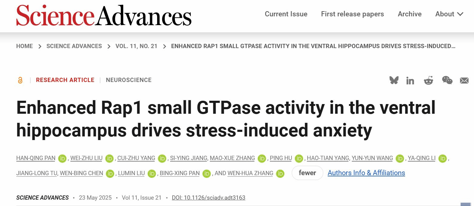 本网讯(生物医学创新研究院、基础医学院)近日,我校生物医学创新研究院/基础医学院潘秉兴课题组与张文华课题组合作在综合性期刊Science Advances上发表了题为“Enhanced Rap1 small GTPase activity in the ventral hippocampus drives stress-induced anxiety”的研究论文。该研究揭示了腹侧海马区锥体神经元中小G蛋白Rap1的异常激活是介导慢性应激诱发焦虑样行为的重要分子机制。