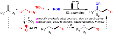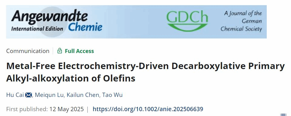 本网讯(化学化工学院)近日,我校化学化工学院蔡琥教授团队和吴涛教授课题组在电化学有机合成领域取得新进展,创新性地开发了一种电化学驱动的无需金属催化剂和传统氧化剂参与的烯烃伯烷基-烷氧基化反应,研究成果以“Metal-Free Electrochemistry-Driven Decarboxylative Primary Alkyl-alkoxylation of Olefins”为题发表在Angewandte Chemie International Edition上。我校化学化工学院陆美群博士为该论文第一作者,蔡琥教授和吴涛教授为共同通讯作者,南昌大学为第一署名单位和通讯单位。