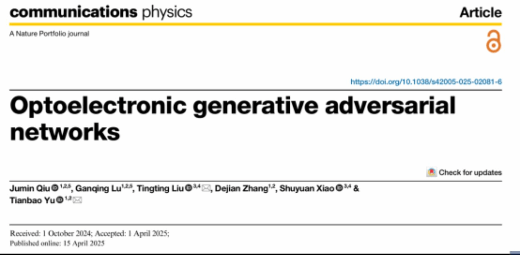 Qiu, J., Lu, G., Liu, T.et al.Optoelectronic generative adversarial networks.Commun Phys8, 162 (2025).
