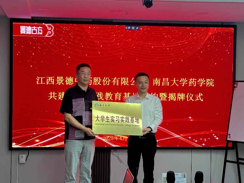南昌大学药学院与景德中药签订了共建校外实践教育基地的协议书,双方将充分利用各自资源优势,共同推动产学研协同发展。会后,吴丹为景德中药股份有限公司授予“大学生实习实践基地”牌。