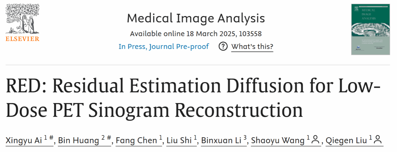 本网讯(信息工程学院)日前,医学图像分析领域顶级期刊Medical Image Analysis(中国科学院大类一区Top期刊,IF:10.7)上刊登发表了我校成像与视觉表示课题组的论文“RED: Residual Estimation Diffusion for Low-Dose PET Sinogram Reconstruction”。论文第一作者是信息工程学院科研助理艾星宇和数学与计算机学院2022级博士研究生黄彬,指导老师为信息工程学院王少宇副教授、施柳副研究员、刘且根教授和合作单位合肥综合性国家科学中心人工智能研究院李炳轩副研究员。