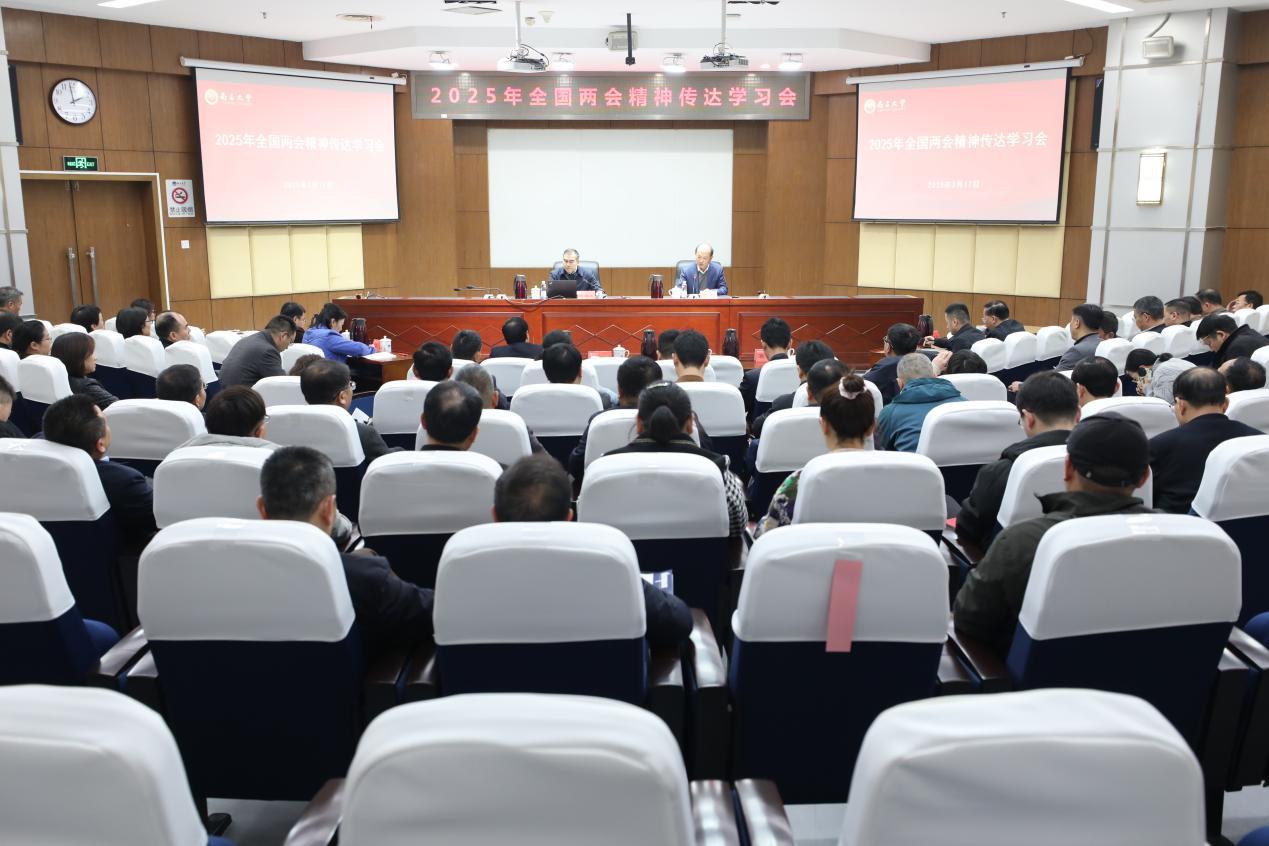 本网讯(记者朱文芳)3月17日,学校召开2025年全国两会精神传达学习会,深入学习贯彻全国两会精神,凝聚共识、深化认知、提高站位、坚定信心,切实用全国两会精神指导、推动、落实学校各项工作。全国人大代表、中国科学院院士、校长陈晔光传达全国两会精神。副校长葛刚主持会议。