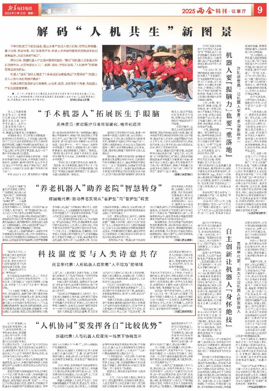 编者按:3月10日,新华每日电讯第9版“2025两会特刊·议事厅”专栏、新华社客户端以《科技温度要与人类诗意共存 闵卫东代表:人形机器人应聚焦“人不能为”的领域》为题报道全国人大代表、我校元宇宙研究院院长闵卫东提出人形机器人发展观点,详情如下: