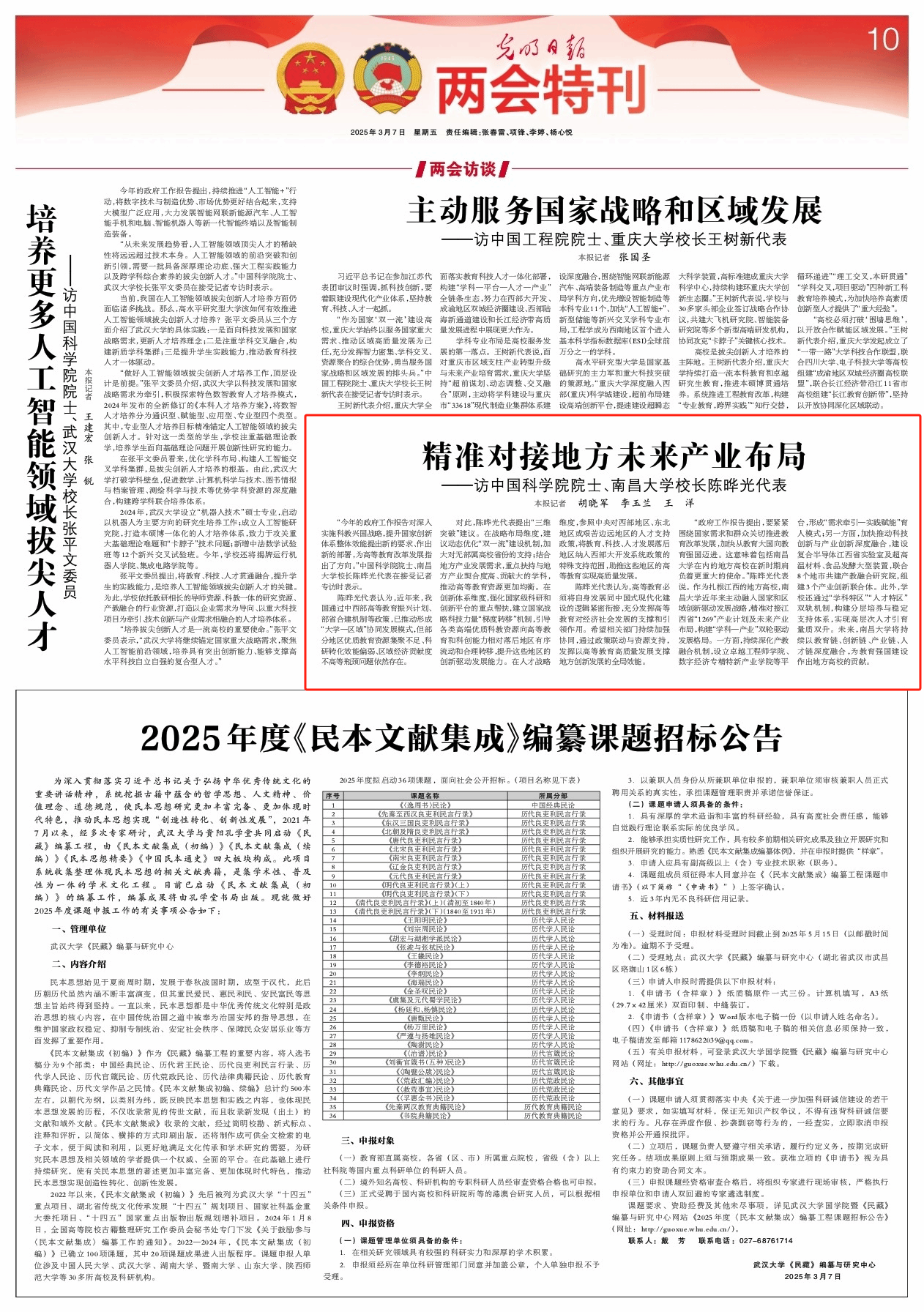 “政府工作报告提出,要紧紧围绕国家需求和群众关切推进教育改革发展,加快从教育大国向教育强国迈进。这意味着包括南昌大学在内的地方高校在新时期肩负着更重大的使命。”陈晔光代表说。作为扎根江西的地方高校,南昌大学近年来主动融入国家和区域创新驱动发展战略,精准对接江西省“1269”产业计划及未来产业布局,构建“学科—产业”双轮驱动发展格局。一方面,持续深化产教融合机制,设立卓越工程师学院、数字经济专精特新产业学院等平台,形成“需求牵引—实践赋能”育人模式;另一方面,加快推动科技创新与产业创新深度融合,建设复合半导体江西省实验室及超高温材料、食品发酵大型装置,联合8个地市共建产教融合研究院,组建3个产业创新联合体。此外,学校还通过“学科特区”“人才特区”双轨机制,构建分层培养与稳定支持体系,实现高层次人才引育量质双升。未来,南昌大学将持续以教育链、创新链、产业链、人才链深度融合,为教育强国建设作出地方高校的贡献。