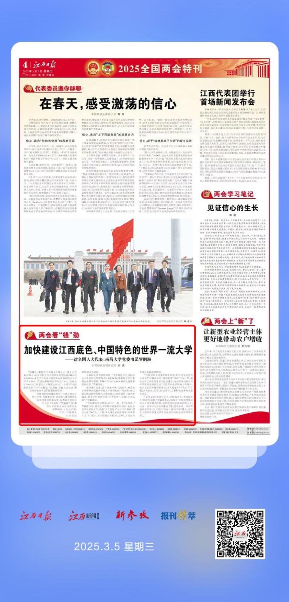 编者按:3月5日,《江西日报》“两会看‘赣’劲”专栏以《罗嗣海:加快建设江西底色、中国特色的世界一流大学》为题,报道全国人大代表、南昌大学党委书记罗嗣海在接受采访时介绍2024年南昌大学工作成效,以及2025年学校在服务社会、学科建设、科技创新等方面发展方向。详情如下:
