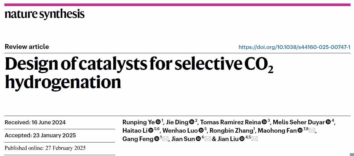本网讯(化学化工学院)近日,我校化学化工学院叶闰平教授在低碳分子催化转化领域中取得了新进展,系统综述了调控CO₂加氢产物选择性的催化剂理性设计进展,研究成果以“Design of catalysts for selective CO₂ hydrogenation”为题发表在Nature Synthesis上,叶闰平为第一作者,合作者美国怀俄明大学Dr. Maohong Fan、南昌大学冯刚教授、中科院大连化物所孙剑研究员和内蒙古大学刘健教授为共同通讯作者,南昌大学为第一署名单位,本文是南昌大学在Nature Synthesis发表的首篇论文。