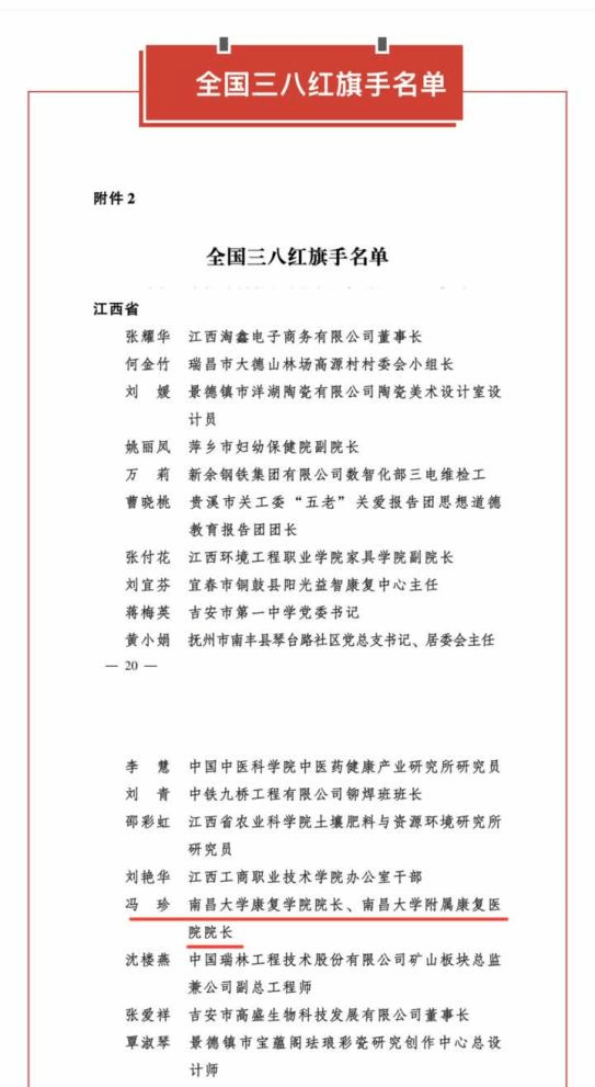 全国三八红旗手是全国妇联授予女性的最高荣誉之一,旨在表彰在各行各业中表现突出、具有榜样作用的女性代表。冯珍教授多年来致力于康复医学学术研究、教学工作和临床实践,带领团队在康复医学领域取得了一系列创新成果,培养了大批优秀的康复医学人才,为推动我国康复医学事业发展、提升康复医疗服务水平贡献了南大力量。她通过努力实现了全省康复医学领域内高质量SCI论文、国家自然科学基金项目、江西省科技进步奖和中国康复医学会科学技术奖、国家级一级学会负责人、国家临床重点专科、国家一流本科专业等多个领域“零”的突破,她的“半蹲式诊疗法”受到患者高度赞誉。此外,她还组织完成了康复本科-硕士-研究生-规范化培训-继续教育全流程人才培养体系的创建,向全国输送了一批批高质量的康复医学人才,填补了江西省康复医学领域国家级继续教育项目的空白。