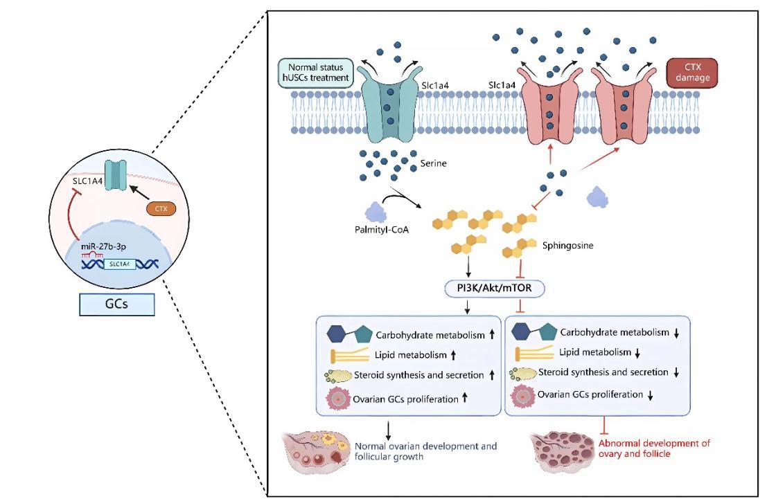 该团队首次报道,人尿液来源的干细胞对环磷酰胺诱发卵巢早衰具有显著防治效果。进一步的研究发现,人尿源性干细胞主要是通过旁分泌外泌体而发挥其治疗作用。他们的研究揭示,外泌体中的miRNA-27b-3p可以特异性地与卵巢内重要靶细胞卵巢颗粒细胞的SLC1A4基因的3’-UTR区域结合,抑制环磷酰胺引起的SLC1A4表达升高,维持卵巢颗粒细胞内丝氨酸的平衡,从而激活PI3K/Akt/mTOR信号通路,减少环磷酰胺引起的卵巢早衰现象。基于这些发现,该团队阐明了SLC1A4及丝氨酸平衡参与的卵巢早衰的全新分子机制。