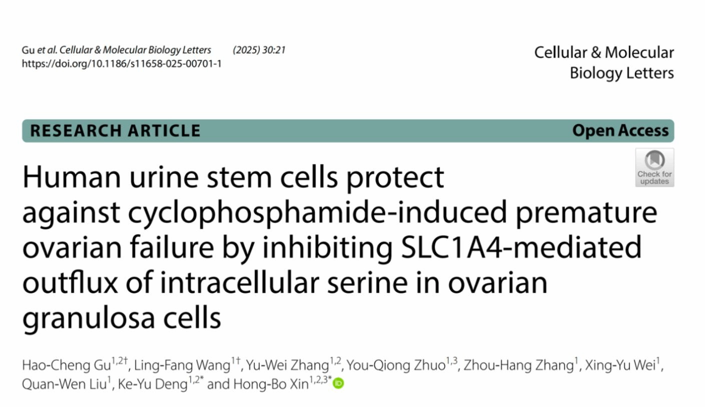 本网讯(转化医学研究院)2月19日,我校转化医学研究院辛洪波教授团队的最新研究成果“Human urine stem cells protect against cyclophosphamide-induced premature ovarian failure via inhibiting SLC1A4-mediated the outflux of intracellular serine in ovarian granulosa cells”在Cellular & Molecular Biology Letters(一区,IF="9.2)上发表。生命科学学院博士研究生顾皓铖及转化医学研究院助理研究员汪玲芳为该论文共同第一作者,南昌大学转化医学研究院邓柯玉教授与辛洪波教授为该论文共同通讯作者,南昌大学为第一单位和通讯单位。