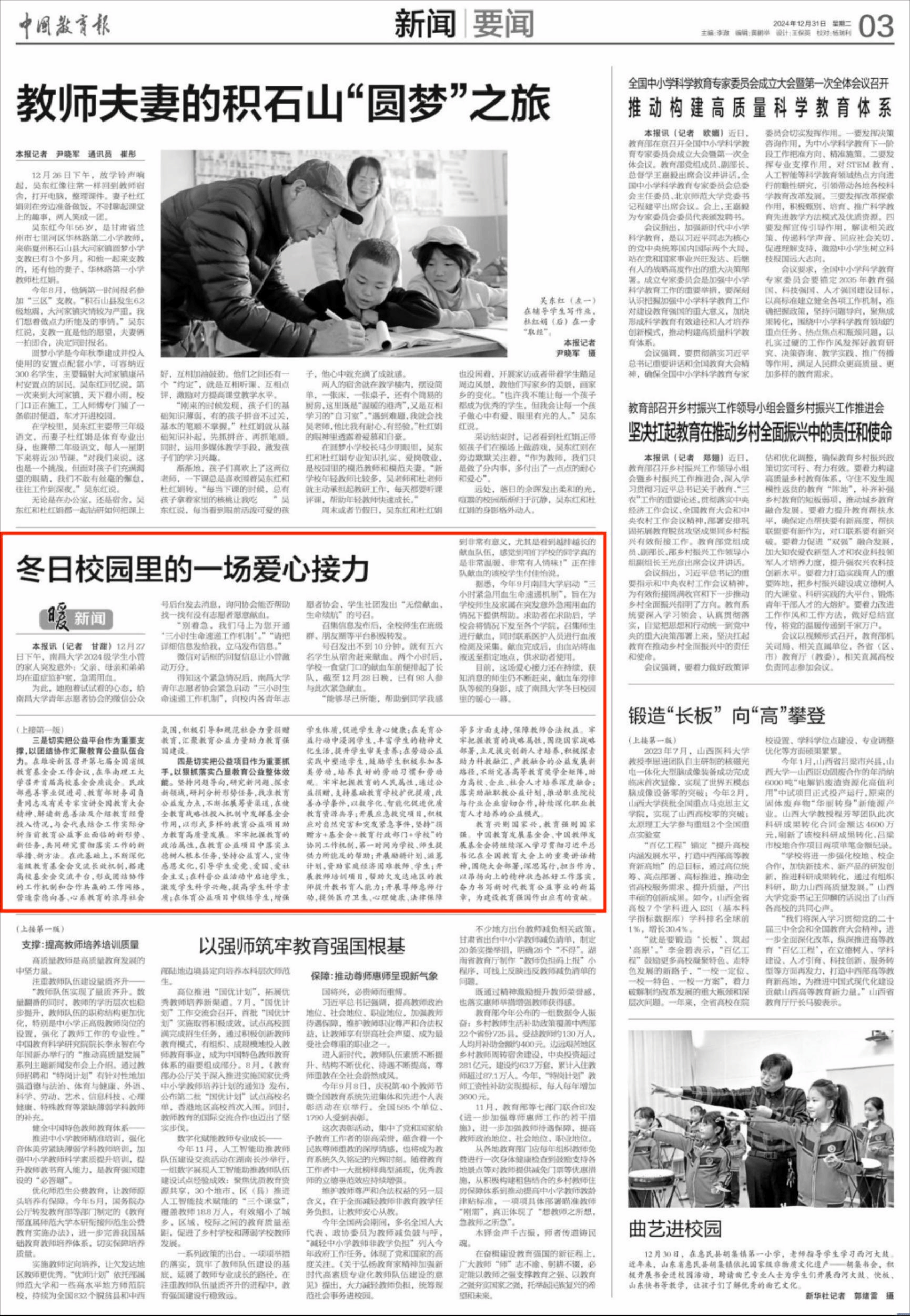编者按:近日,《中国教育报》以《冬日校园里的一场爱心接力》为题,报道南昌大学紧急启动三小时生命速递工作机制,师生协力,紧急献血救助学子家属的暖心事迹。详情如下: