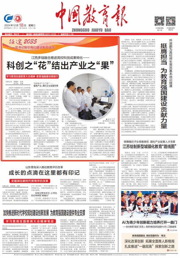“到2035年建成教育强国,是党中央作出的重大决策部署,是习近平总书记念兹在兹、殷切期盼的‘国之大者’。我们将全面贯彻落实党的二十届三中全会和全国教育大会精神,大力推动创新链、产业链、资金链、人才链深度融合,加强高校科学研究和技术研发,促进科技成果转移转化,更好服务江西经济社会高质量发展。”江西省委教育工委书记、省教育厅厅长吴永明的话语掷地有声。
