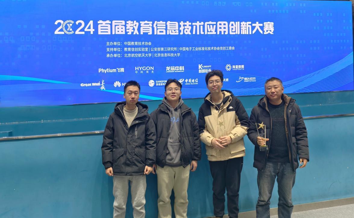 本网讯(数学与计算机学院)12月15日,2024首届教育信息技术应用创新大赛在北京圆满落幕。我校数学与计算机学院由研究生杨正宇、汤清、刘嘉昕组成的“数字先锋”团队,在邓庚盛老师和邱桃荣老师的指导下参加比赛。经过多轮激烈角逐,团队在“基于信创环境的软件适配”赛项中表现优异,在全国912支参赛队伍中脱颖而出,荣获全国一等奖、华东地区一等奖。