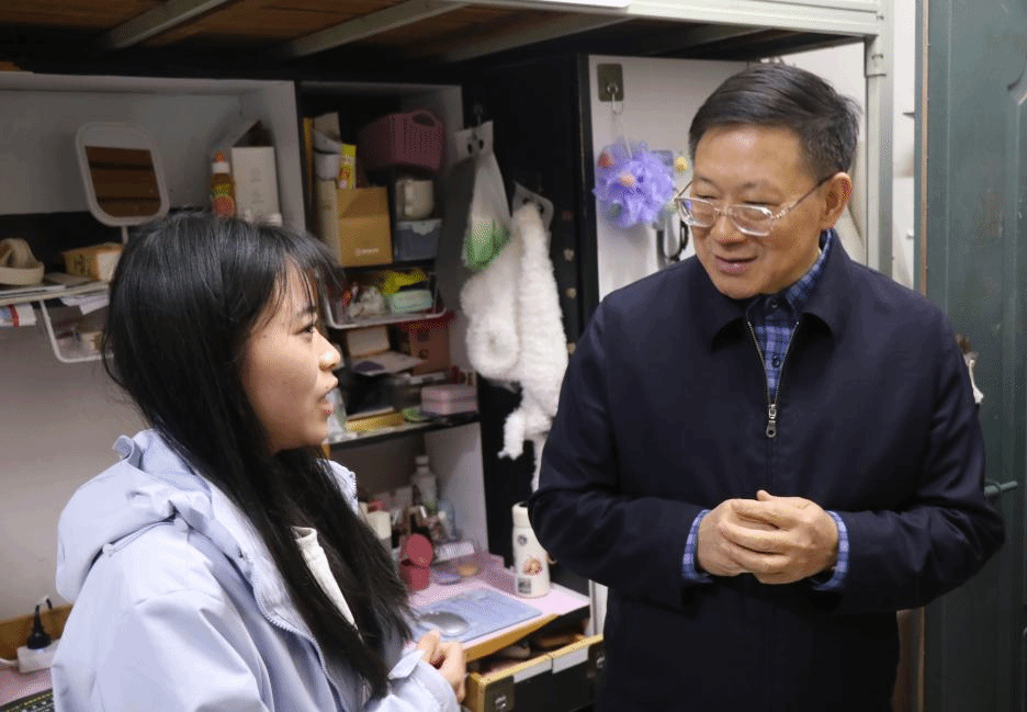 “同学们都来自哪里?”“学习生活方面还习惯吗?”“都参与了哪些社团活动?”在新闻与传播学院学生宿舍,罗嗣海与同学们亲切交流,了解同学们在校学习生活情况,叮嘱大家注意防寒保暖,并将棉被送到同学们手中,表达学校的关心关爱。他勉励同学们胸怀远大理想抱负,担当时代赋予的重任,成为德智体美劳全面发展的社会主义建设者和接班人。