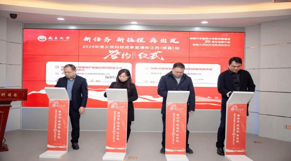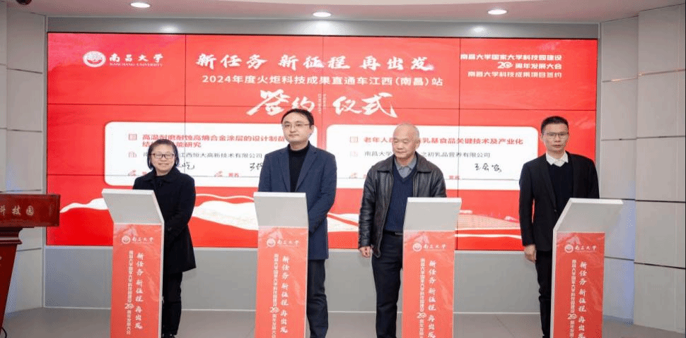 会上,南昌大学国家大学科技园 “新质生产力——低空经济概念验证中心”正式启动,为科技园的未来发展注入了强劲的新动力。会上还举行了南昌大学成果转化签约仪式,南昌大学与赣州能之光新材料有限公司、江西泽合新电子科技有限公司、江西恒大高新技术有限公司、江西人之初乳品营养有限公司等签订科研项目成果转化协议,为科技创新与产业发展的深度融合奠定基础。