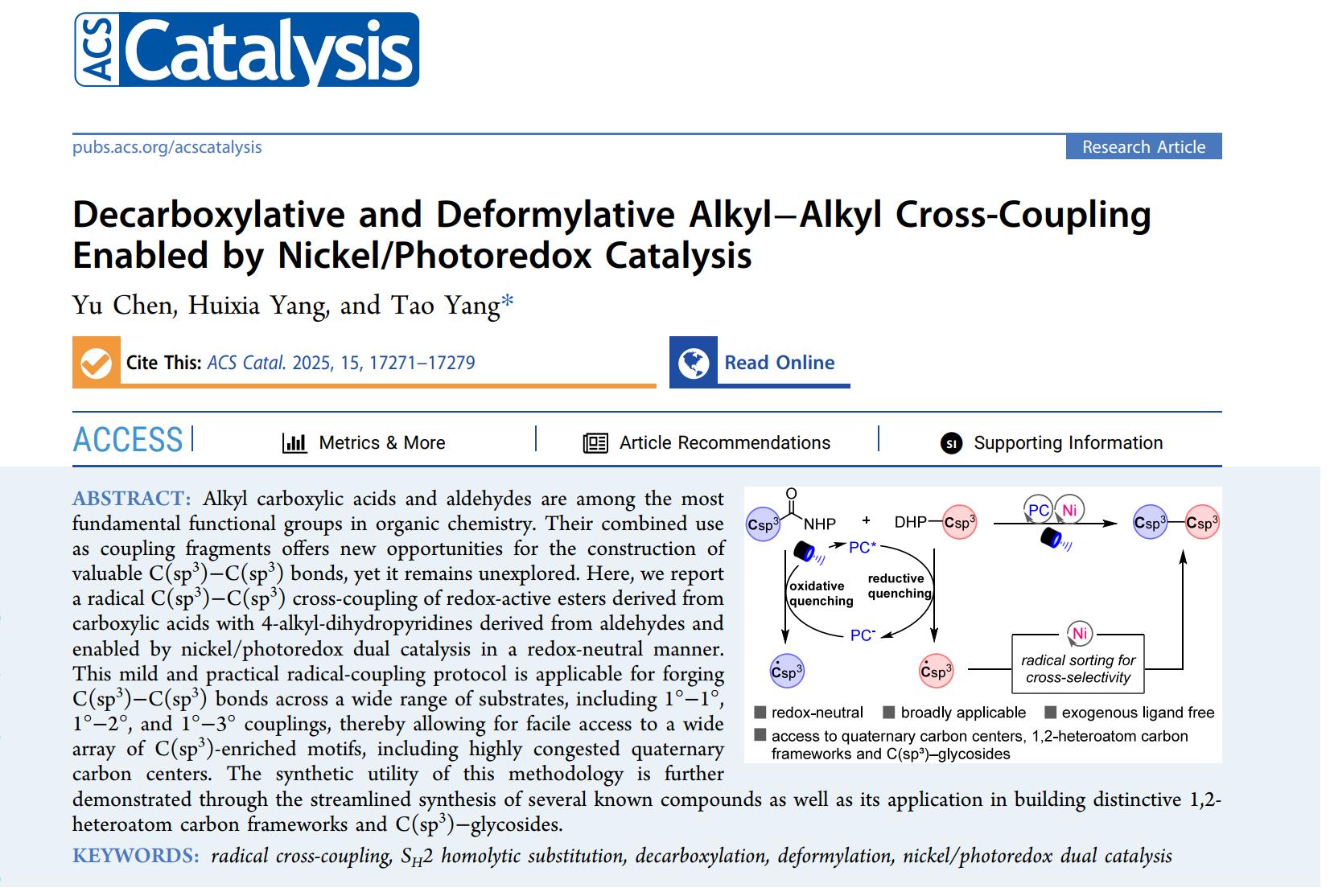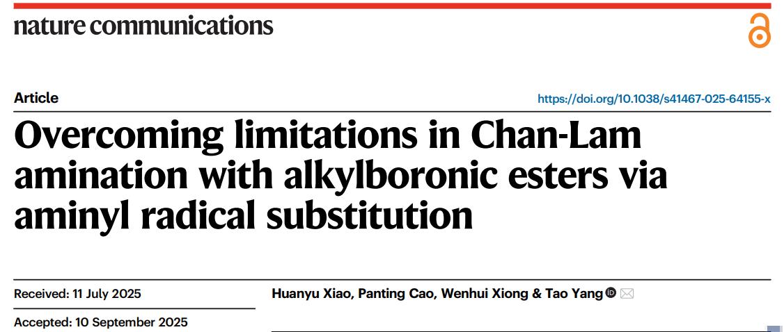 本网讯(化学化工学院)近日,我校化学化工学院杨涛教授课题组在自由基介导的三维化学键构建取得重要进展,相关成果分别以“Overcoming limitations in Chan-Lam animation with alkylboronic esters via aminyl radical substitution”和“Decarboxylative and Deformylative Alkyl-Alkyl Cross-Coupling Enabled by Nickel/Photoredox Catalysis”为题在国际顶级学术期刊《Nature Communications》和催化领域知名期刊《ACS Catalysis》上在线发表,南昌大学为唯一完成单位。
