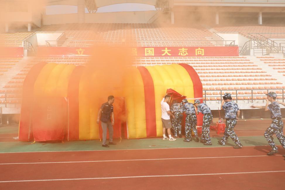 警报骤响!橙色的烟雾瞬间从模拟火点喷涌而出,在灼热的空气中翻滚扩散。他们迅速紧捂口鼻,弯腰冲入演练场,有序撤离。他们在浓烟弥漫中紧张穿梭,充满着突破模拟险境的自豪与底气。